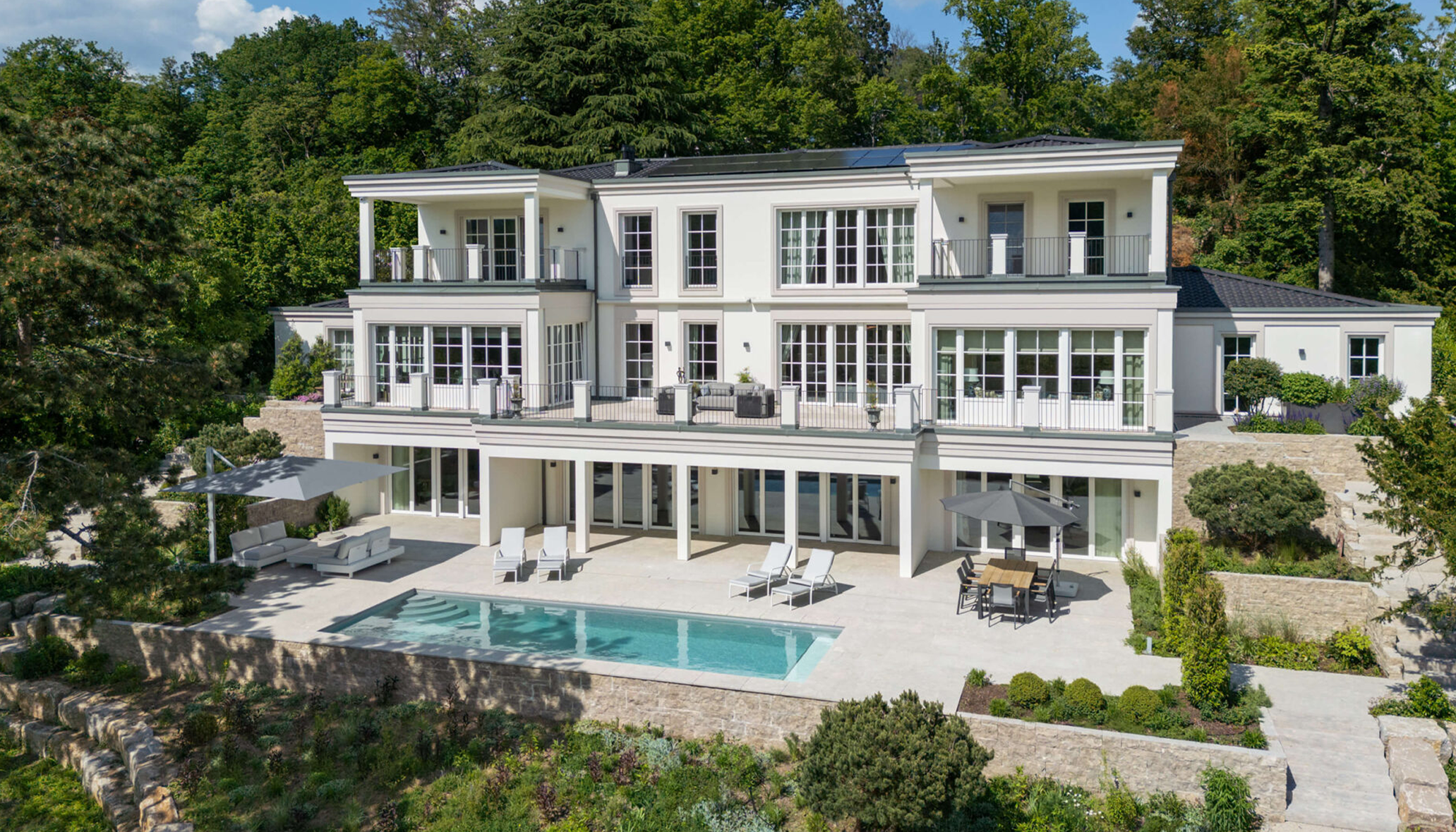Eine imposante Residenz in Hanglage, die klassische Eleganz mit modernem Komfort vereint. Großzügige Fensterfronten, weitläufige Terrassen und ein Infinity-Pool schaffen ein exklusives Wohnambiente inmitten der Natur.