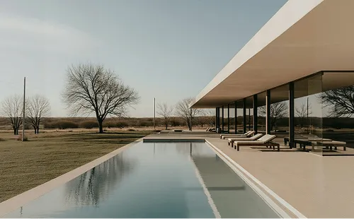 Ein modernes Refugium mit klarer Architektur und weitläufigen Glasfronten, das Innen- und Außenbereich nahtlos verbindet. Umgeben von üppiger Landschaftsgestaltung bietet dieses Zuhause lichtdurchflutete Räume und eine Atmosphäre der Ruhe und Offenheit